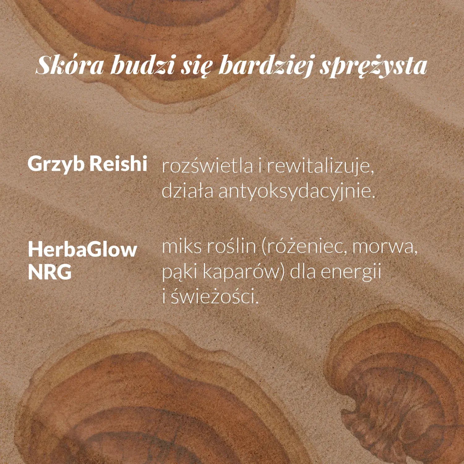 Ujednolicenie kolorytu i rozjaśnienie przebarwień - adaptogeny Reishi i Różeniec Górski oraz roślinne antyoksydanty poprawiają koloryt skóry, redukują oznaki zmęczenia i szarości.