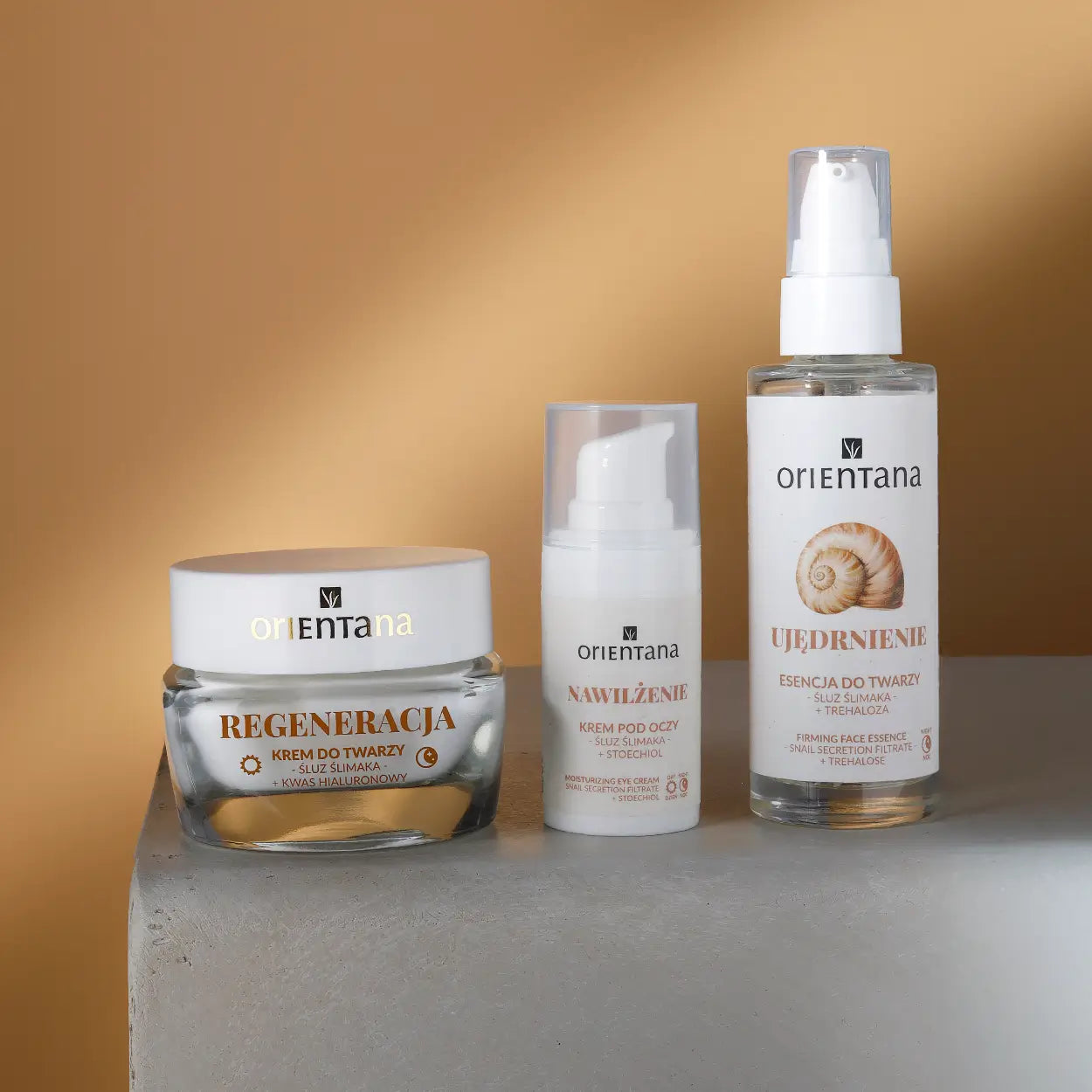 Śluz ślimaka , którego pozyskiwanie ze ślimaków nie krzywdzi ich i jest dla nich całkowicie bezpieczne ma wiele korzyści dla skóry. To bogate źródło naturalnego kolagenu, elastyny, kwasu glikolowego, allantoiny, witamin i naturalnych antybiotyków. Ma silne działanie naprawcze, regenerujące, wygładzające, ujędrniające. Bardzo popularny w krajach azjatyckich w kosmetykach do pielęgnacji cery problemowej. Sprawdzi się także na skórze podrażnionej, w stanie zapalnym, a nawet po zabiegach chirurgii plastycznej i zabiegach inwazyjnych kosmetologii estetycznej gdyż błyskawicznie regeneruje skórę. Dzięki swoim właściwościom znacząco redukuje blizny i sprawia, że stają się mniej widoczne i wygładzone. Śluz ślimaka ma zastosowanie do różnorodnych problemów skórnych i sprawdza się w przypadku każdej cery. Dzięki zawartości alfa-hydroksykwasów i antybiotyków, śluz ślimaka efektywnie wspomaga walkę z trądzikiem. Dzięki zawartości przeciwutleniaczy i mukopolisacharydów ochroni skórę przed czynnikami powodującymi starzenie, a stosowany na cerę dojrzałą będzie wygładzał zmarszczki. Mocne działanie nawilżające śluzu ślimaka sprawi, że cera sucha zostanie dogłębnie nawilżona. Kremy ze śluzem ślimaka zyskały już uznanie wśród Polek. Jednak warto pamiętać, iż tylko Orientana oferuje kosmetyki naturalne ze śluzem ślimaka o wzorowym składzie – ponad 98% naszych składników to składniki naturalne.