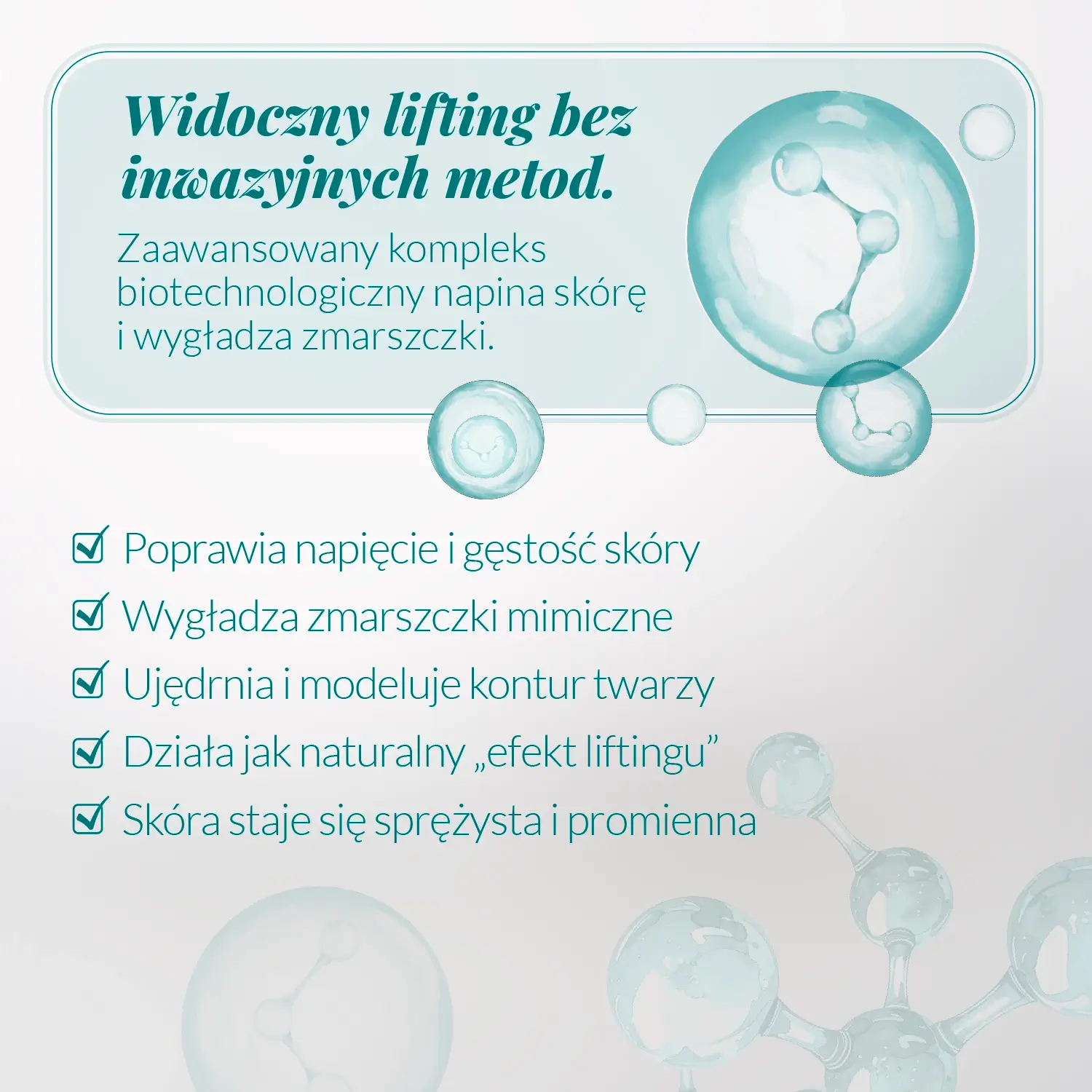 Intensywnie liftingujący krem do twarzy, który łączy zaawansowaną technologię biomimetyczną z mocą natury. Formuła oparta na kolagenie z mikroalg (peptydach kolagenowych), peptydach biomimetycznych oraz kofeinie skutecznie wspiera poprawę jędrności i sprężystości skóry, a także redukcję oznak zmęczenia. Potrzebujesz 10 minut by zauważyć efekt ujędrniający skórę.