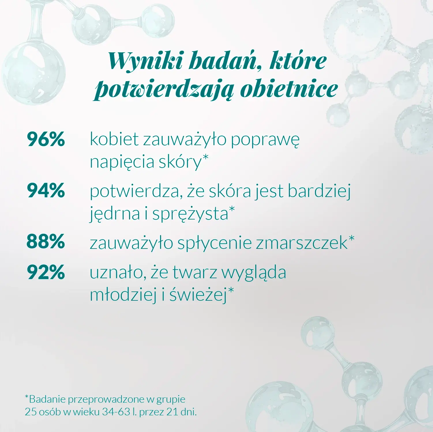 Poprawa jędrności i napięcia skóry - 92% badanych wskazało na wyraźną poprawę jędrności, a 88% zauważyło szybki efekt ujędrniający już w ciągu 10 minut od zastosowania kremu. Efekt intensywnego nawilżenia - 100% osób zauważyło, że skóra staje się dobrze nawilżona i miękka w dotyku, a uczucie komfortu utrzymuje się przez wiele godzin. Redukcja oznak starzenia - 96% uczestników testów zauważyło poprawę blasku skóry, a ponad połowa potwierdziła zmniejszenie widoczności zmarszczek, co świadczy o skutecznym działaniu przeciwstarzeniowym. Wzmocnienie i regeneracja - 88% osób odczuło, że skóra staje się bardziej sprężysta i mocniejsza, a 100% potwierdziło efekt ukojenia, szybkiej regeneracji oraz złagodzenia podrażnień. Przyjemność stosowania - 100% badanych uznało krem za komfortowy i przyjemny w użyciu, odpowiedni pod makijaż, pozostawiający skórę jedwabiście gładką. 92% uczestników podkreśliło również jego relaksujący zapach, który zamienia codzienną pielęgnację w odprężający rytuał.