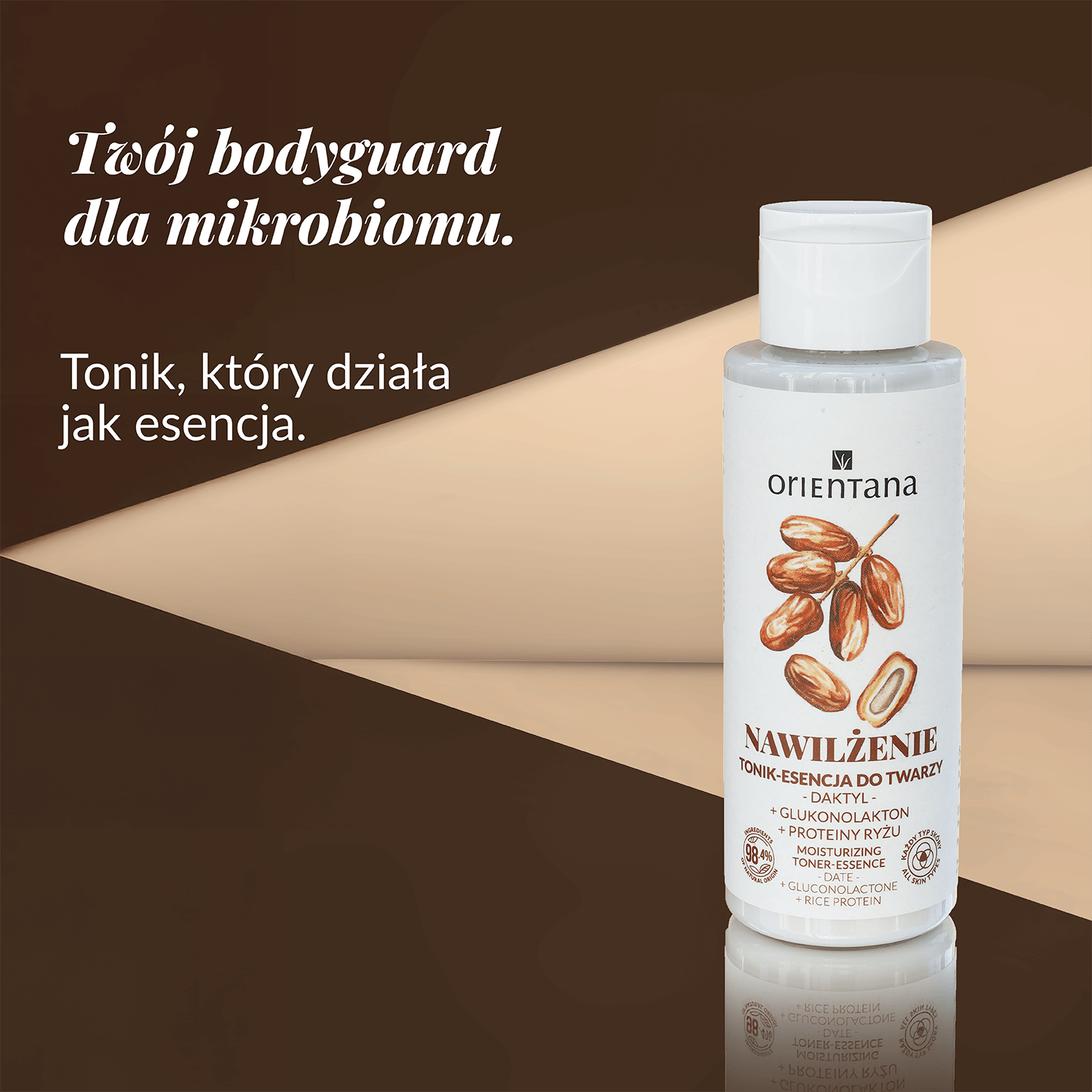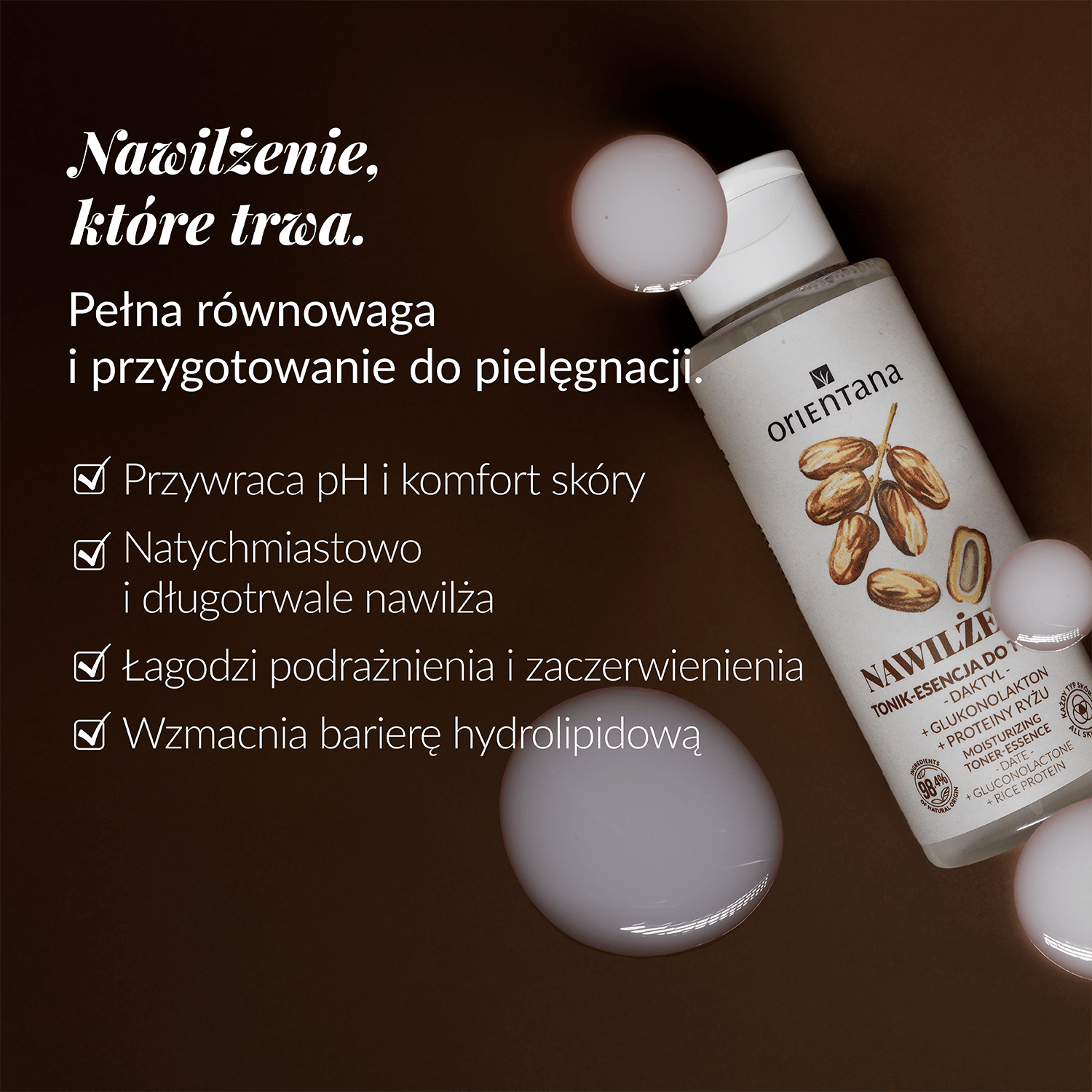 Multifunkcyjny kosmetyk łączący działanie toniku i esencji. Oparty na łagodnie złuszczającym i wiążącym wodę glukonolaktonie, proteinach ryżu i ekstrakcie z daktyla, - wspierających regenerację skóry. Przywraca skórze pH, nawilża oraz wzmacnia barierę hydrolipidową. Idealny do codziennego stosowania, także dla skóry wrażliwej.